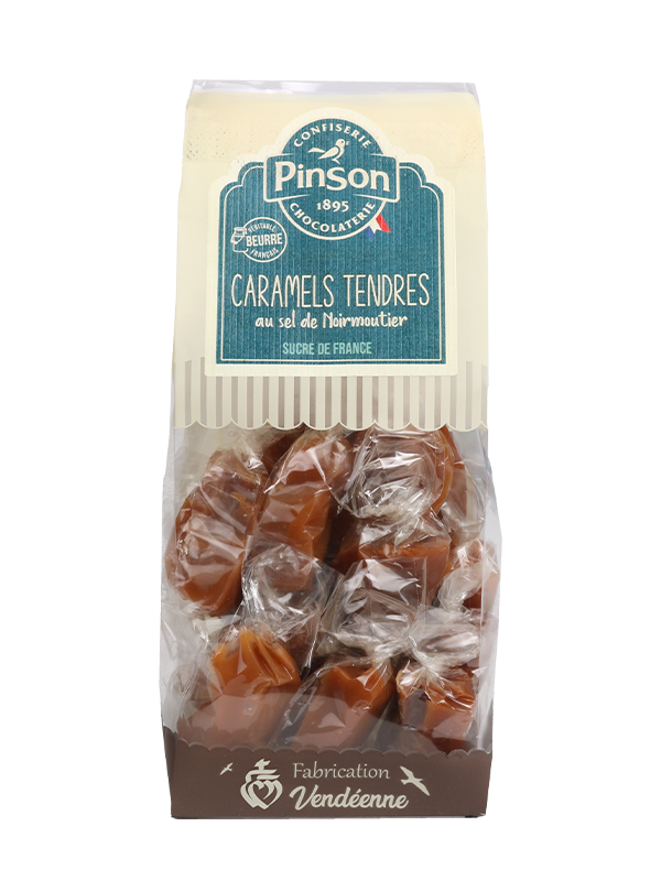 Retrouvez vos souvenirs d'enfance grâce à la tendresse des caramels tendres Pinson. Leur cuisson dans des chaudrons en cuivre ainsi que les notes délicates de beurre et de sel de Noirmoutier leur donnent ce goût si particulier.DU SEL DE NOIRMOUTIER