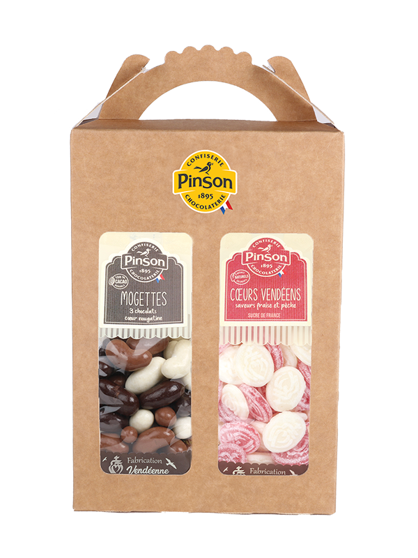 Bonbons saveurs Fraise & Pêche forme Cœur Vendéen et Nougatine Amandes et Graines de Tournesol enrobée de chocolat blanc, lait et noir, forme haricot