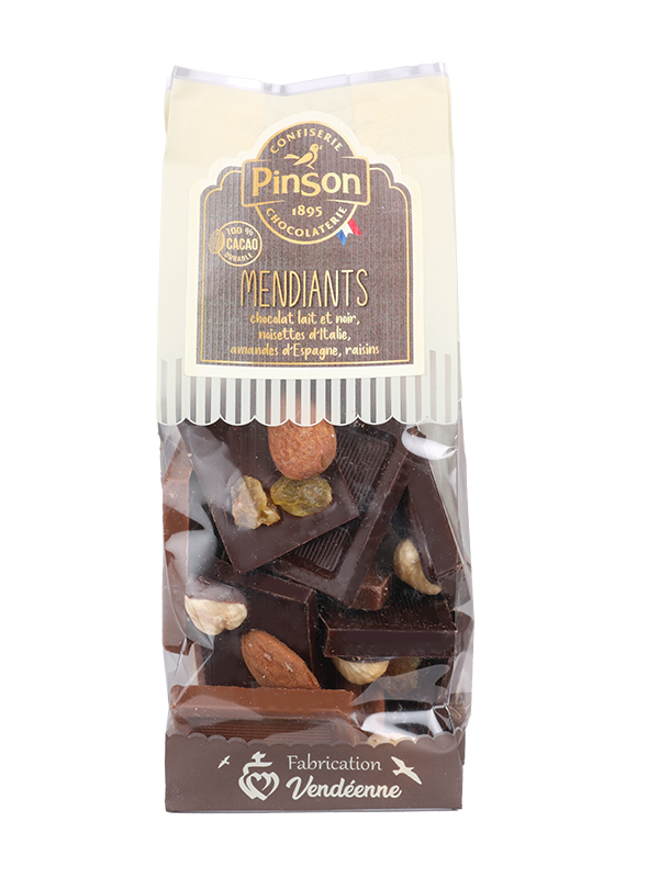 L'incontournable des fêtes de fin d'année, le mendiant ! De jolis chocolats noir ou lait parsemés de raisins, amandes et noisettes. Ainsi, chaque bouchée vous promet une explosion de saveurs et une texture croquante qui ravira vos papilles.
