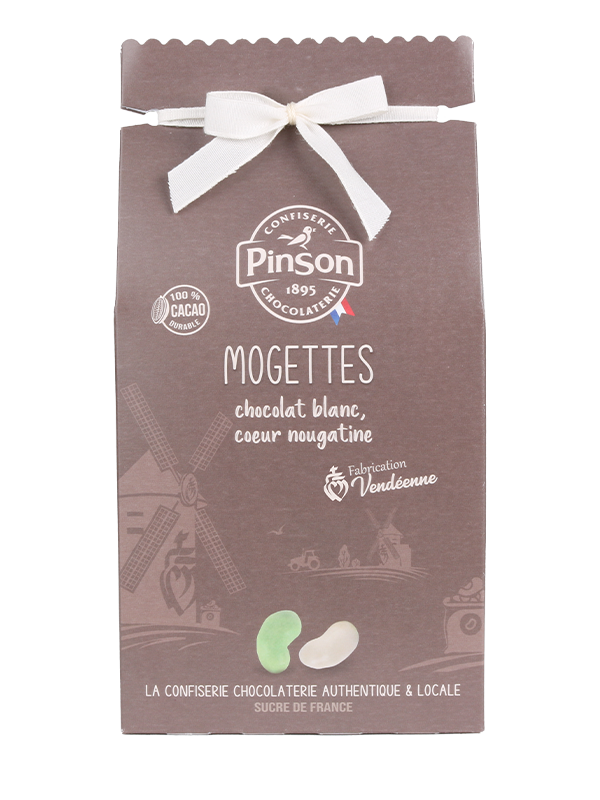 Pinson vous propose de découvrir cette spécialité vendéenne : une mogette au cœur nougatine enrobée d'une onctueuse couche de chocolat blanc. Offrez la dans ce joli ballotin !