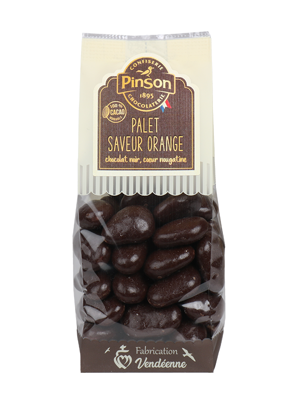 Pour les fêtes, la Chocolaterie Pinson vous propose ses palets vendéens au chocolat noir saveur orange cœur nougatine. Une recette aussi gourmande qu'originale pour les fêtes qui séduira les amateurs de chocolat noir et d'orange ne pourront être que séduits.QUALITÉ ET SAVOIR-FAIRE FRANÇAIS