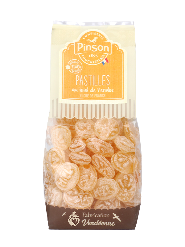 Depuis ses débuts, Pinson fabrique des bonbons au miel. Aujourd'hui, il n' est pas toujours aisé de savoir la provenance des miels que nous achetons et d'en connaitre leur exacte composition. C'est pourquoi, Pinson a choisi de fabriquer des bonbons au miel de Vendée. Ainsi il s'assure de la provenance locale de son miel mais également de sa composition. Faites-vous plaisir tout en bénéficiant des bienfaits du miel ! Le saviez-vous ? Le miel ne se périme jamais et peut se consommer indéfiniment !