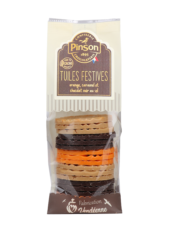 Pour les fêtes, laissez vous tenter par nos tuiles en chocolat ! Ces douceurs chocolatées raviront tous les gourmands. Découvrez trois saveurs irrésistibles : orange pour une note fruitée, chocolat noir au sel de Noirmoutier pour une touche salée, et chocolat blanc au caramel pour l'ultra gourmandise.DES INGRÉDIENTS DE QUALITÉ